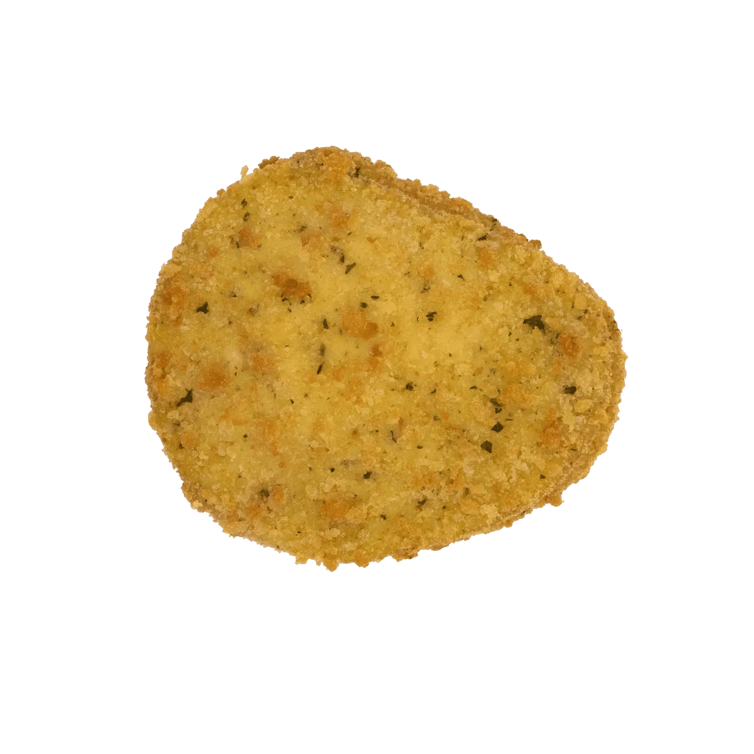Exquisita y tierna pechuga de pollo rebozada y rellena de queso suave, ligeramente especiado.